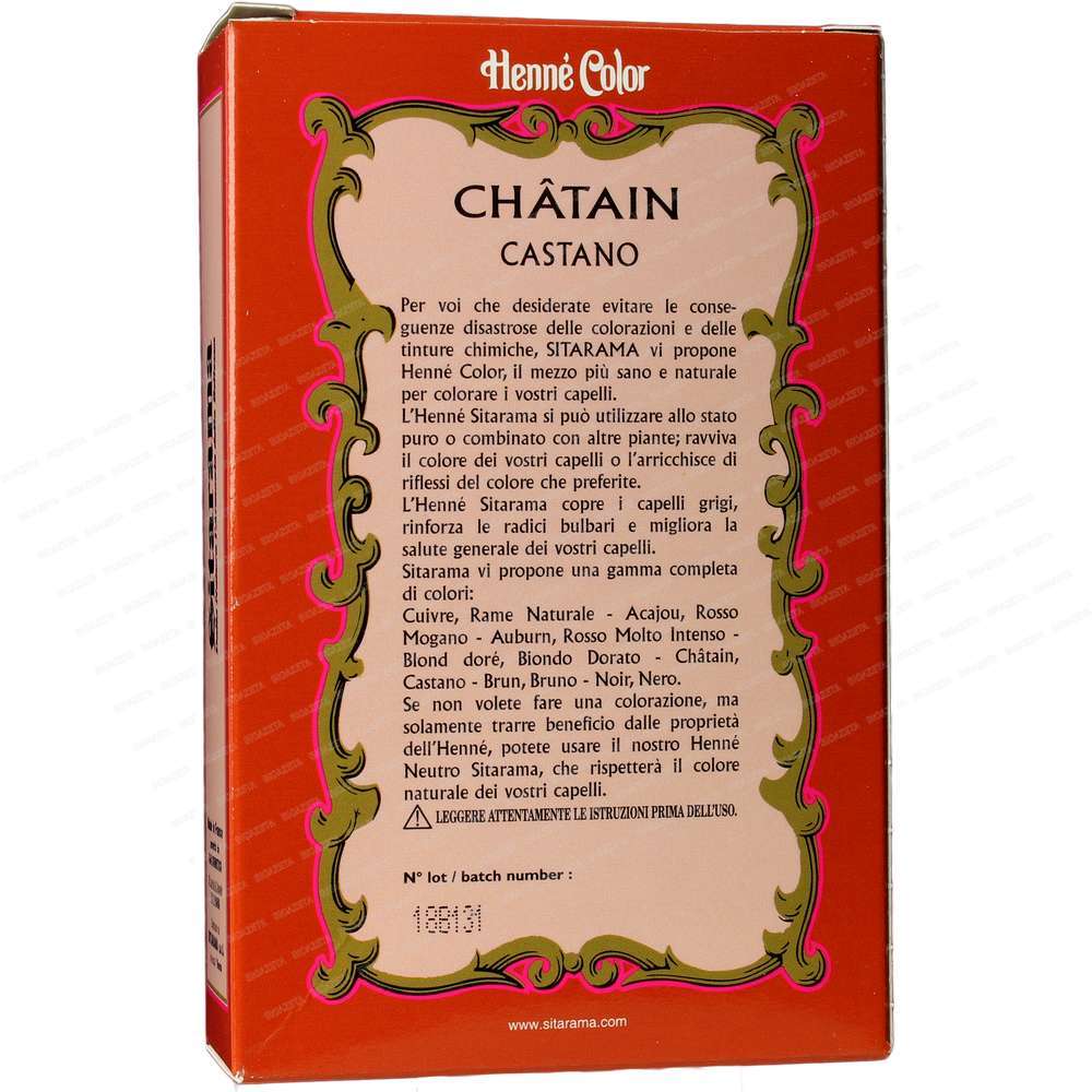Sitarama Hennè Castano polvere 100g; L’Henné Color è una linea basata su la polvere di henné (Lawsonia Inermis) e miscelata con altre polveri vegetali derivate da piante tintoree; un vero e proprio trattamento di bellezza per i vostri capelli. L’Henné è un’erba tintorea dai numerosi benefici, oltre a colorare, pulisce i capelli, li rinforza, li volumizza, li rende più lucidi e corposi. E’ ideale per chi ha capelli fini e deboli e chi ha problemi di forfora. Con l’uso prolungato aiuta le persone che soffrono di psoriasi e dermatite e risolve anche i problemi delle doppie punte. Secondo analisi di laboratorio l’henné avrebbe anche virtù antimicotiche e astringenti.