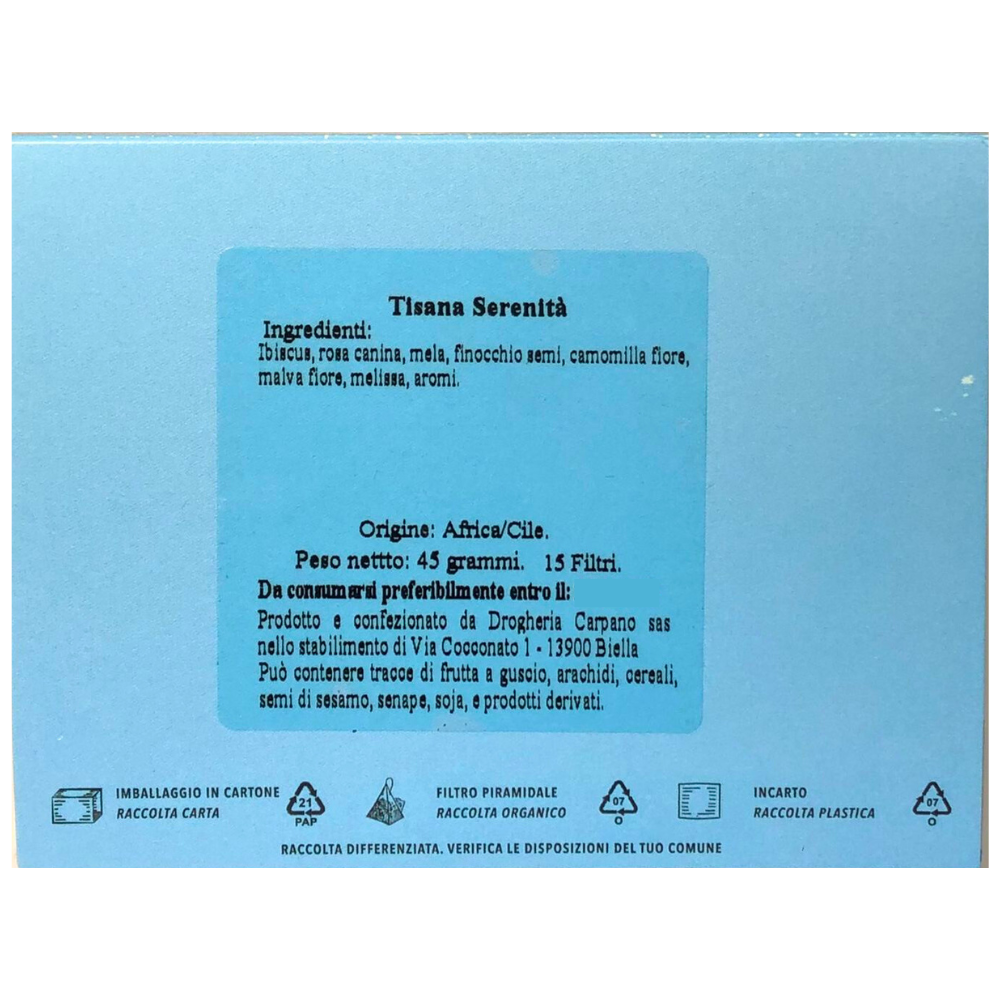 Tisana SerenitĂ 15 filtri piramidali Carpano; Filtri singolarmente incartati. Ingredienti: Ibiscus, rosa canina, finocchio semi, camomilla fiore, malva fiore, melissa, aromi.
