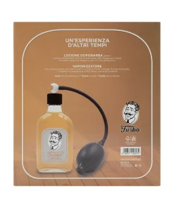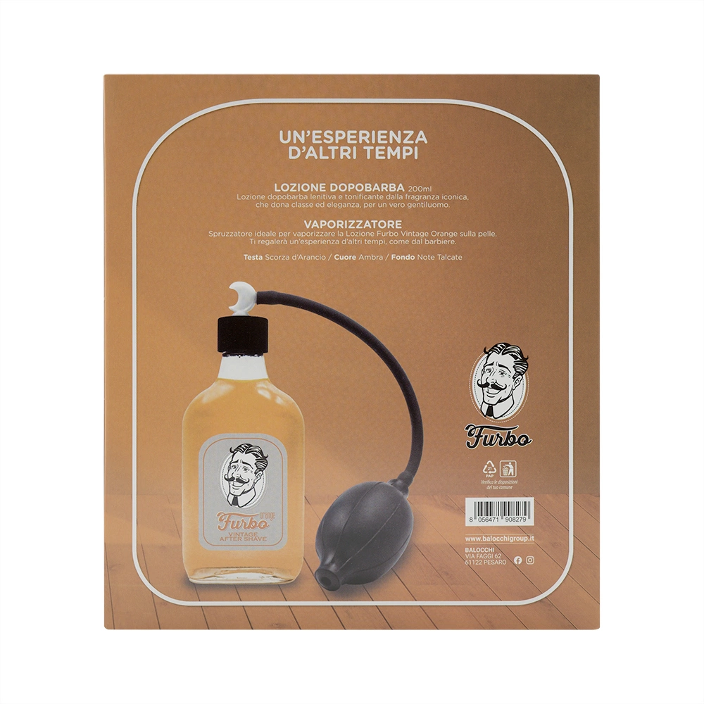 Il cofanetto Furbo Orange un’esperienza d’altri tempi, include:Furbo Vintage Orange After Shave 200ml: lozione dopobarba lenitiva e tonificante dalla fragranza vintage e iconica, per un uomo elegante.Furbo Vapos nero per vivere l’esperienza d’altri tempi come dal barbiere.