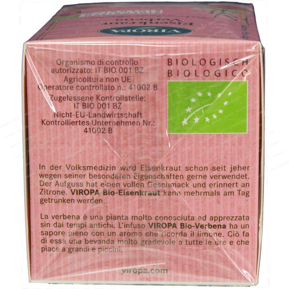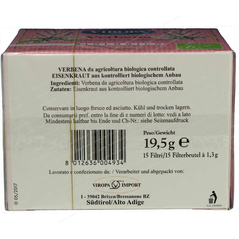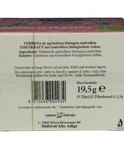 Viropa Verbena bio 15 filtri (Verbena officinalis L.) cresce dal mare alla zona alpina di tutta l’Italia nei campi, lungo le strade e nei giardini. Si utilizzano le sommità fiorite raccolte in luglio – agosto che si fanno poi essiccare all’aria. Tradizionalmente si usa come stimolante della digestione, analgesico e come uso esterno (gargarismi) trova impiego per disinfettare e tonificare bocca e gola.